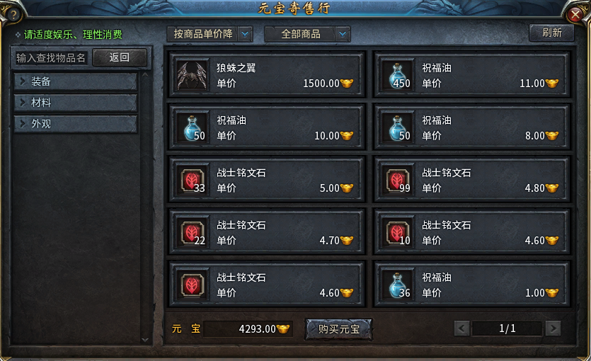 1.进入元宝寄售行界面,可查看寄售物品详细属性等信息。
